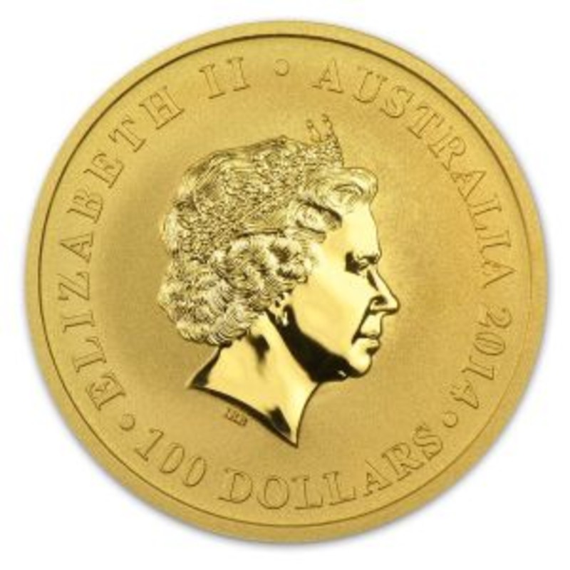 На аверсе золотой монеты Австралийский кенгуру изображён портрет королевы Елизаветы II. Сверху надпись ELIZABETH II  — Елизавета II, AUSTRALIA — Австралия и год выпуска монеты. Внизу номинал монеты 100 DOLLARS. С нижней стороны портрета имеется надпись «IRB», обозначающая инициалы автора изображённого портрета – Иена Рэнка-Бродли.