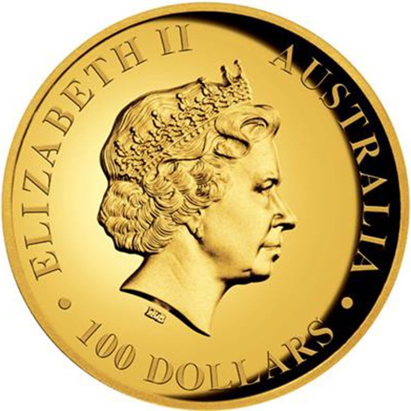 На аверсе золотой монеты Австралийский кенгуру изображён портрет королевы Елизаветы II. Сверху надпись ELIZABETH II — Елизавета II, AUSTRALIA — Австралия и год выпуска монеты. Внизу номинал монеты 100 DOLLARS. С нижней стороны портрета имеется надпись «IRB», обозначающая инициалы автора изображённого портрета – Иена Рэнка-Бродли.