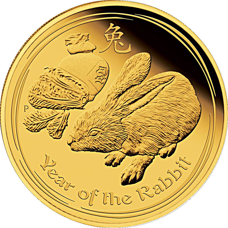 На реверсе изображен кролик с капустой. Вверху: 兔 (китайский иероглиф Кролик), слева монограмма Пертского монетного двора Р, внизу: Year of the Rabbit.