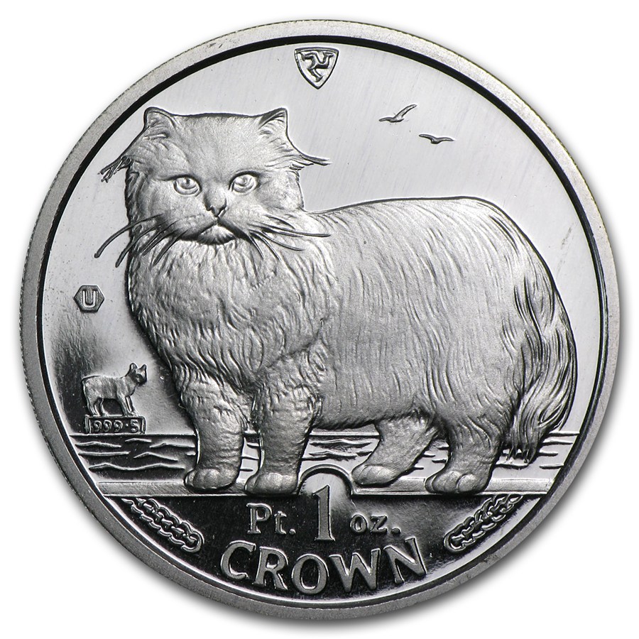 Платиновая монета Острова Мэн «Персидский кот» 1989 года выпуска из серии «Коты». Монета отчеканена в Монетном дворе Побджой (Великобритания).