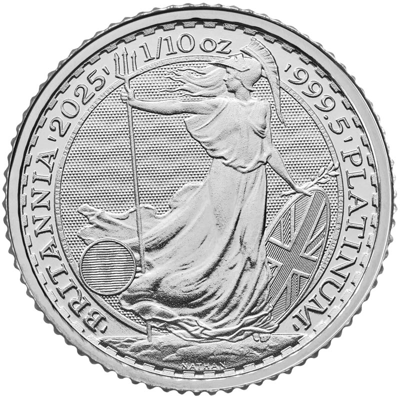 На реверсе монеты - персонифицированный символ Великобритании в виде молодой женщины в коринфском шлеме, с гербовым щитом и трезубцем Посейдона в руке. Легендарная фигура Британии символизирует британскую силу и единство на монетах со времен Римской империи. Фамилия художника NATHAN высечена маленькими буквами на скале под ногами Британии. Вдоль канта надпись, разделенная точками: 'BRITANNIA'2025' 1/10 oz '999.5'PLATINUM' (Британия, год чеканки, вес и проба платины).
