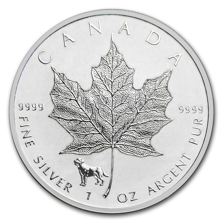 Канадская серебряная монета «Кленовый лист» с маленьким изображением собаки