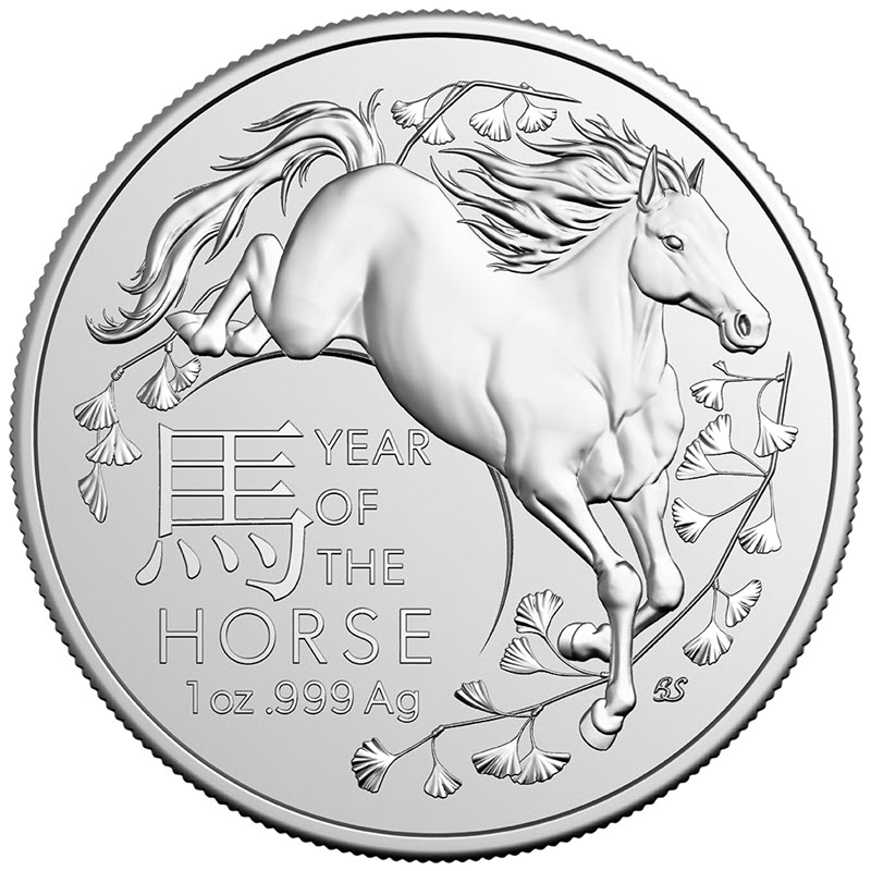 На реверсе изображена скачущая лошадь. Слева внизу надпись: 馬 YEAR OF THE HORSE 1 oz .999 Ag (год Лошади, вес и проба серебра). Внизу справа инициалы дизайнера: BS (Bronwyn Scott).