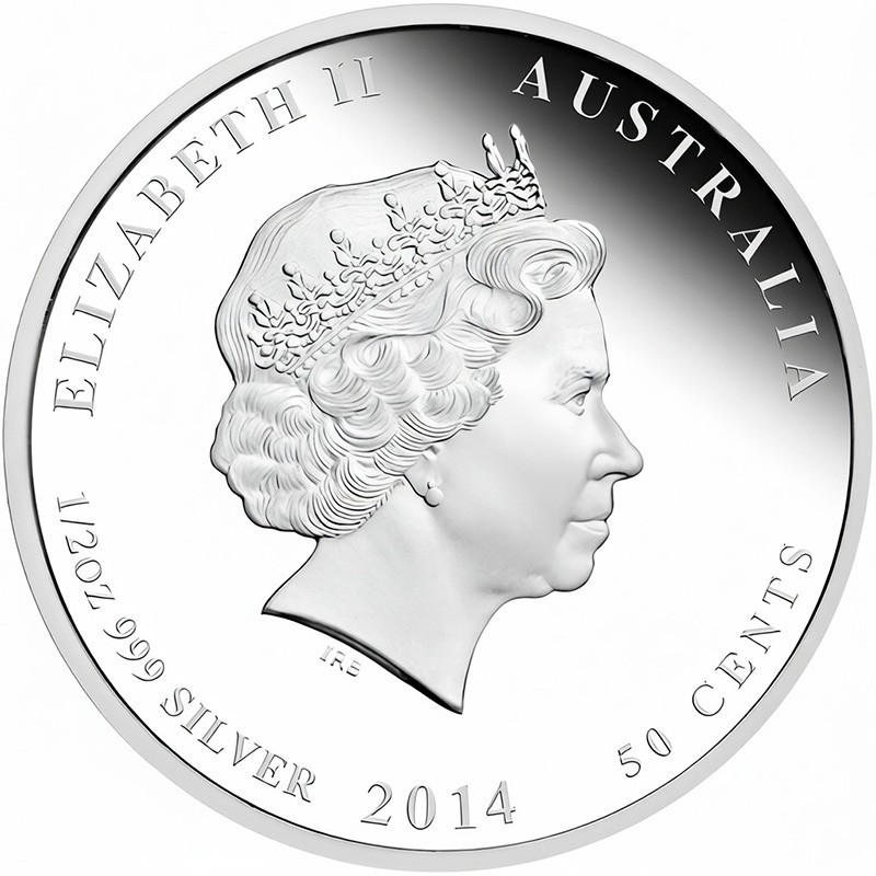 На аверсе изображен профиль королевы Елизаветы II дизайнера Яна-Рэнка Бродли. Вверху надпись ELIZABETH II  AUSTRALIA (Елизавета II, страна-эмитент). Внизу по ободу указан год чеканки (2014), номинал монеты (50 CENTS), вес (1/2 oz) и проба серебра в монете (999 SILVER).