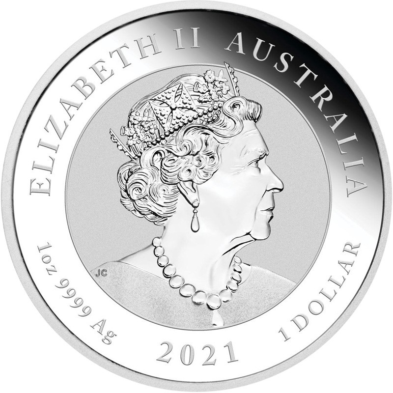 На аверсе изображен портрет Её Величества Королевы Елизаветы II дизайнера – JC (Джоди Кларк). Вдоль канта надписи: ELIZABETH II AUSTRALIA 2021 1 oz 9999 Ag 1 DOLLAR (Елизавета II, страна-эмитент, вес и проба серебра, год чеканки, номинал).