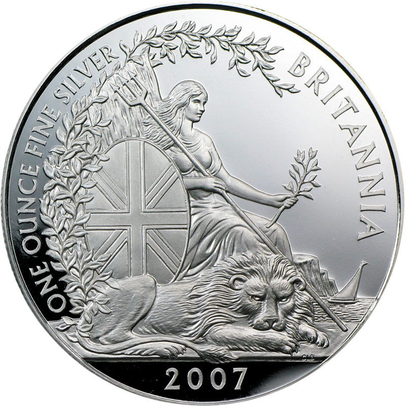 В центре - уникальная композиция работы дизайнера Кристофера Ле Брана (Christopher Le Brun), созданная специально к 20-летнему юбилею серии. На нем изображена сидящая Британия, прислонившаяся к дереву. В её руках трезубец и оливковая ветвь, а у ног лежит лев. На заднем плане видны белые скалы Дувра и парусник. Вдоль канта надпись: ONE OUNCE FINE SILVER BRITANNIA (вес и проба серебра, название серии). В нижней части в отдельном сегменте указан год чеканки — 2007.