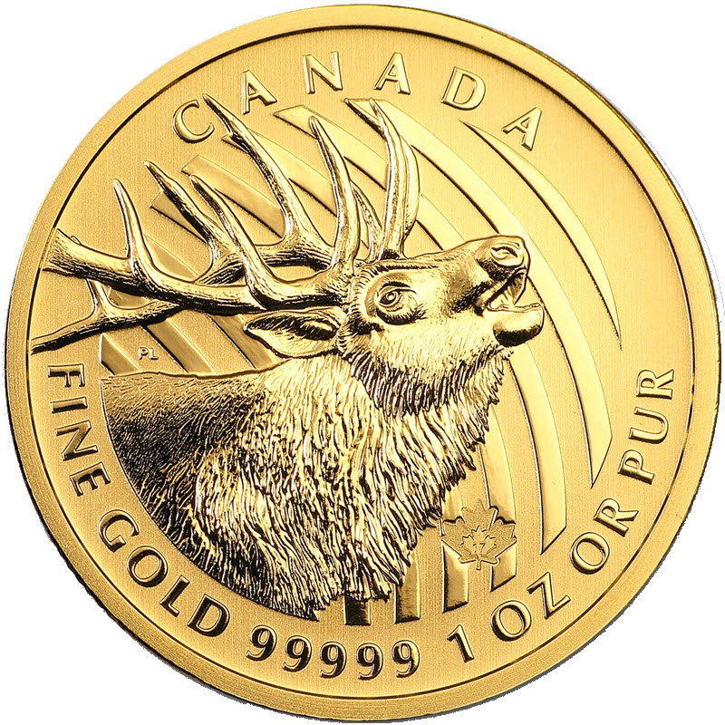 На реверсе изображен лось вапити – один из крупнейших представителей семейства оленей в мире. Внизу по ободу помещена надпись: «FINE GOLD 99999 1 OZ OR PUR» (1 унция золота пробы 0,99999 или чистого золота), вверху указана страна-эмитент – «CANADA» (Канада).