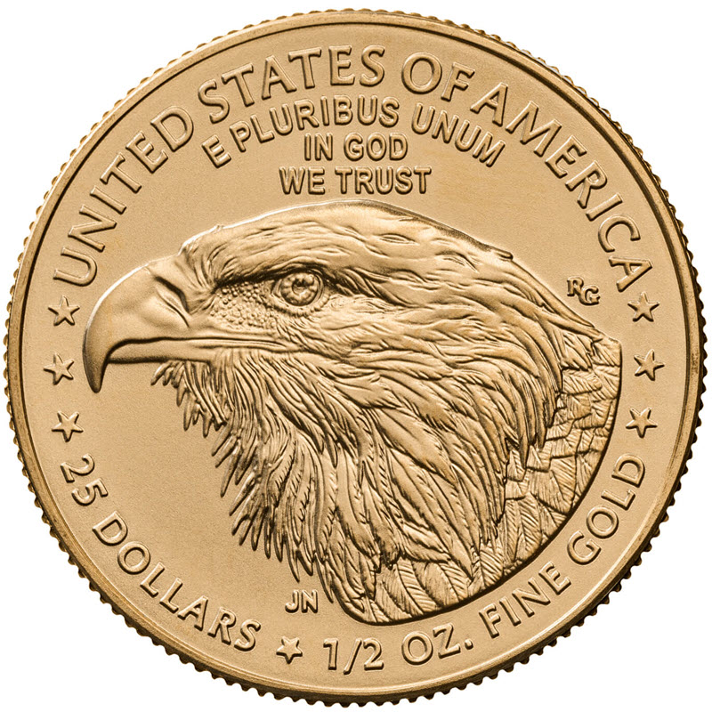 На реверсе изображение белоголового орлана, пристально смотрящего на зрителя. Выше и ниже шеи орла инициалы дизайнеров: RG (Renata Gordon) JN (Jennie Norris). Вдоль канта надпись: UNITED STATES OF AMERICA E PLURIBUS UNUM IN GOD WE TRUST ★★★ 25 DOLLARS ★ 1/2 OZ. FINE GOLD ★★★ (страна-эмитент, Из многих – одно, Мы верим в Бога, номинал, вес и проба золота).