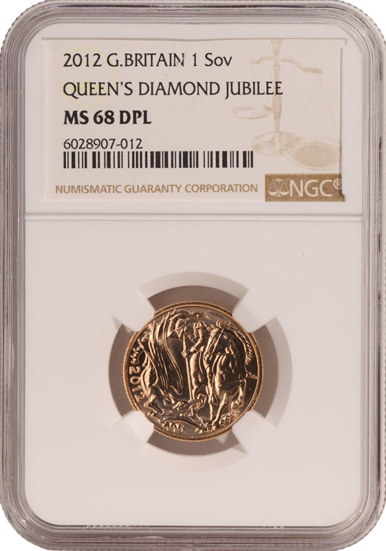 В честь Бриллиантового юбилея Её Величества Королевы на реверсе монеты представлено редкое отступление от классической интерпретации Пиструччи. Для выпуска монеты «Соверен» 2012 года Королевский монетный двор объявил конкурс на создание нового дизайна. Победу одержал эскиз, предложенный британским скульптором Полом Деем.
