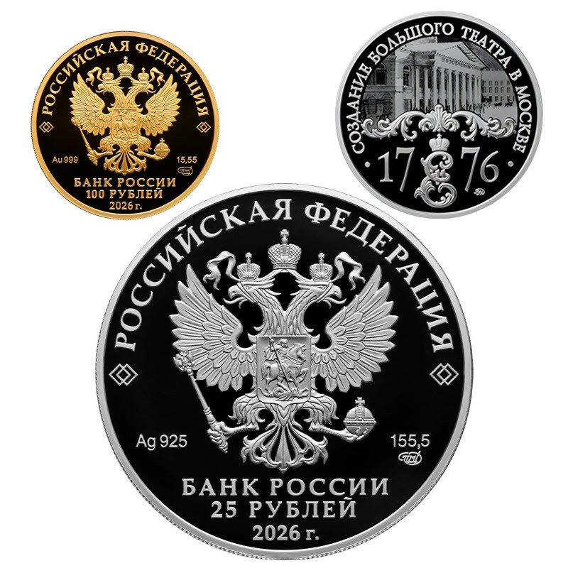 Набор "250-летие Большого театра России" 2026 г. выпуска качества «пруф» из серии «Исторические события». Поставляется в футляре.