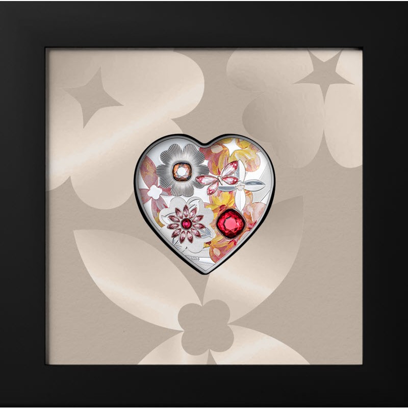 Эта чудесная серебряная монета из серии «Бриллиантовая любовь» посвящена любви и волшебному Дню святого Валентина. У нее размеры 37 Х 37 мм, качество пруф, селективная окраска и кристаллические вставки. Поставляется в оригинальном футляре с сертификатом подлинности. Тираж: 2026 штук.