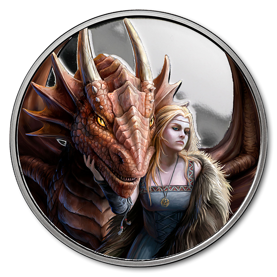 Особый дизайн дракона от Анны Стоукс. На нем изображен вид сверху великого дракона с открытым крылом. Прекрасно окруженный размахом крыльев, голова дракона повернута, поднятая вверх, и изогнутый остроконечный хвост. В верхней части монеты читается текст «Драконы Анны Стоукс», а в центре нижнего текста отображается вес и чистота