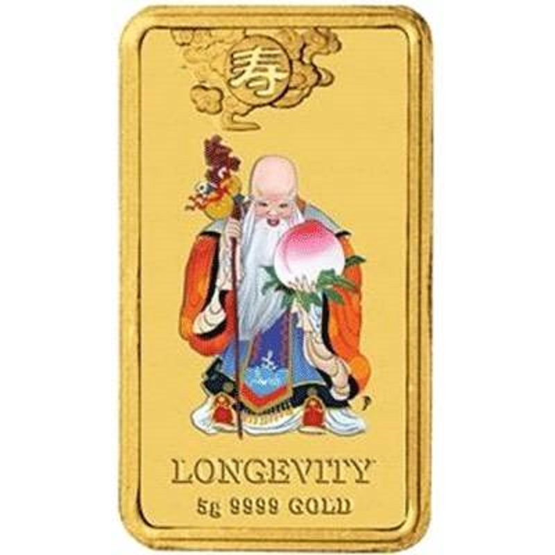 В верхней части реверса монеты помещен соответствующий иероглиф, обозначающий на китайском языке «Долголетие». По центру реверса находится цветное изображение соответствующего мифологического персонажа-божества. В нижней части указано название символа на английском языке - "Longevity", вес монеты и драгоценный металл.