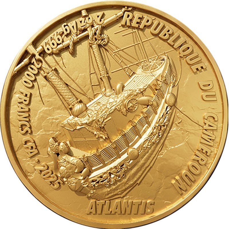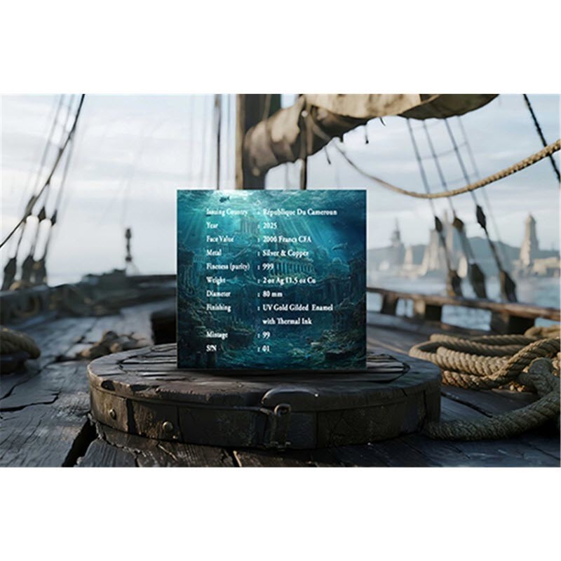 На аверсе изображение затонувшего корабля. Вдоль канта надпись: REPUBLIQUE DU CAMEROUN 2 oz Ag 999 · 2000 FRANCS CFA · 2025 ATLANTIS (страна-эмитент, вес и проба серебра, номинал, год чеканки, Атлантида). На гурте индивидуальный номер монеты.