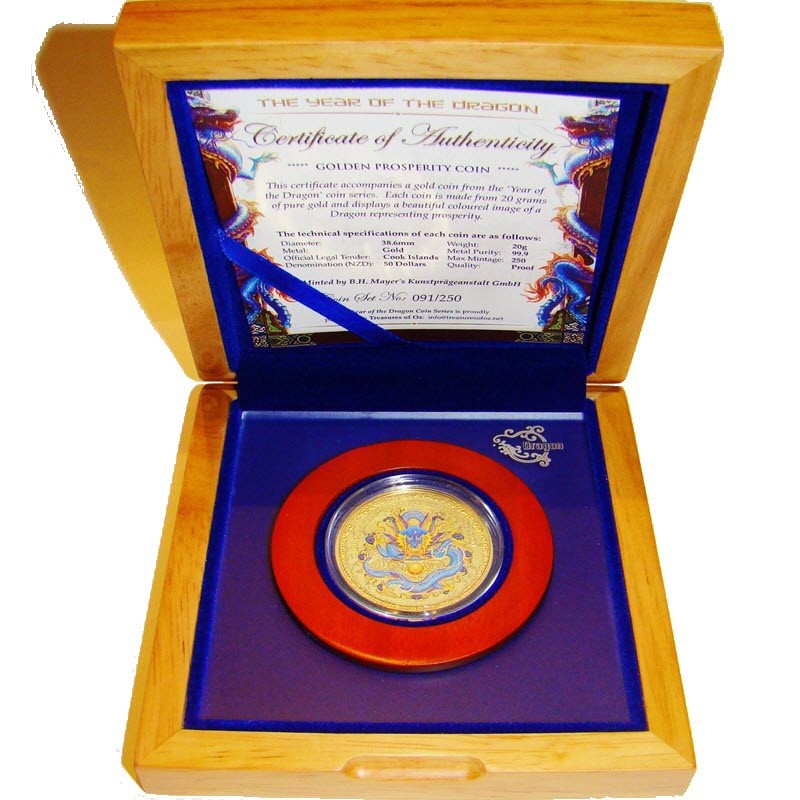 Золотая монета весом в 20 грамм посвящена тем, кто родился в китайский лунный год Дракона. Жёлто-голубой дракон отвечает за успех в новых делах. Он ассоциируется с дождем, который приносит земле воду. Земля плодоносит, поэтому этот дракон является символом богатства и процветания. Жёлто-голубой дракон изображён с золотистой жемчужиной, которая способна исполнить любое желание. Монета имеет качество Proof и поставляется в элегантном футляре вместе с сертификатом подлинности.