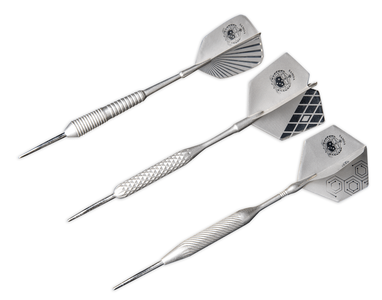 Реверс каждой монеты представляет собой настоящий дротик во всех деталях, настолько, что его действительно можно использовать! Каждая украшена разным мотивом (солнечным светом, ромбовидным и механическим узором).