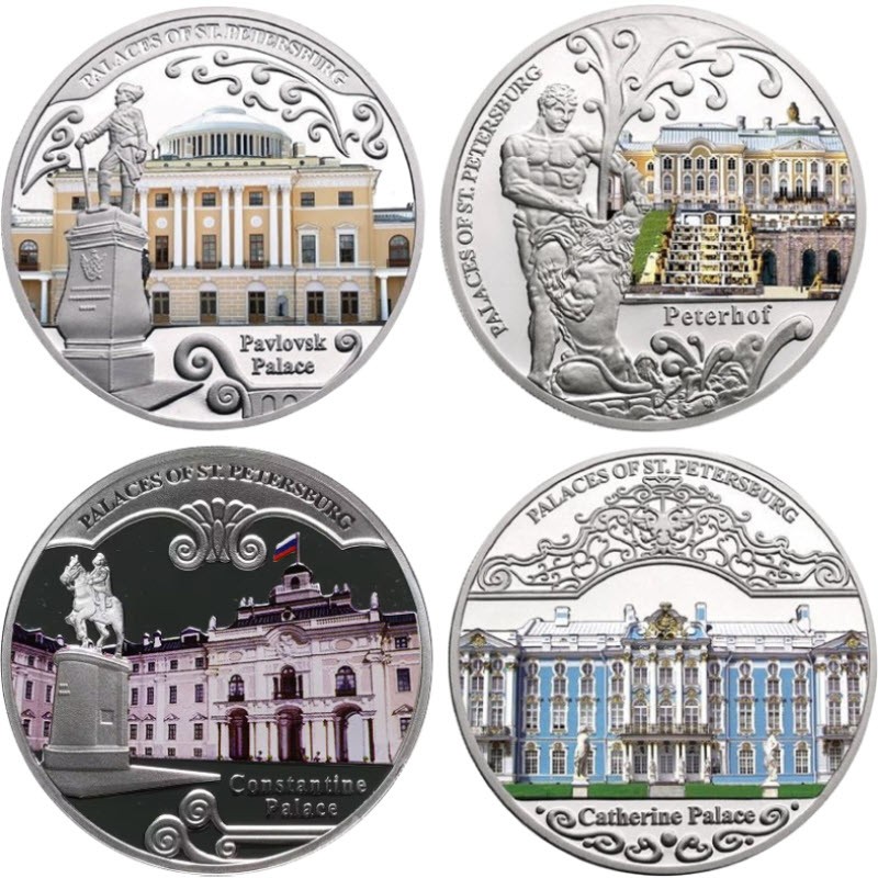 Набор из 4-х серебряных монет Малави "Дворцы Санкт-Петербурга" 2010 г.в., 4*31.1 г чистого серебра (проба 999)