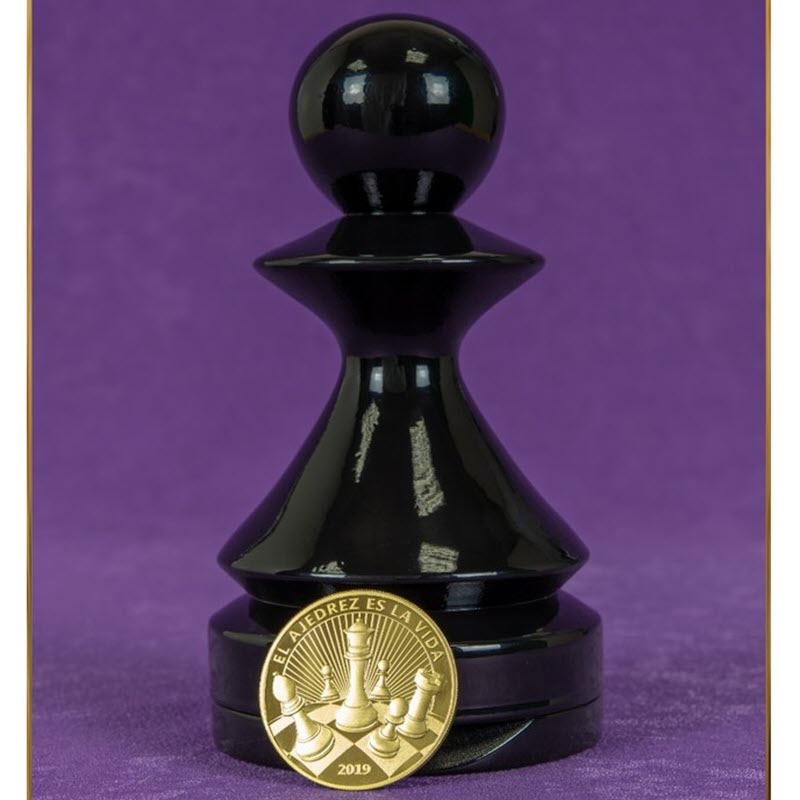 На реверсе золотой монеты «Шахматы» — изображение шахматной доски-земного шара, шахматных фигур. Сверху надпись на испанском языке «EL AJEDREZ ES LA VIDA» — «Шахматы — это жизнь». Внизу — год выпуска золотой монеты (2019).