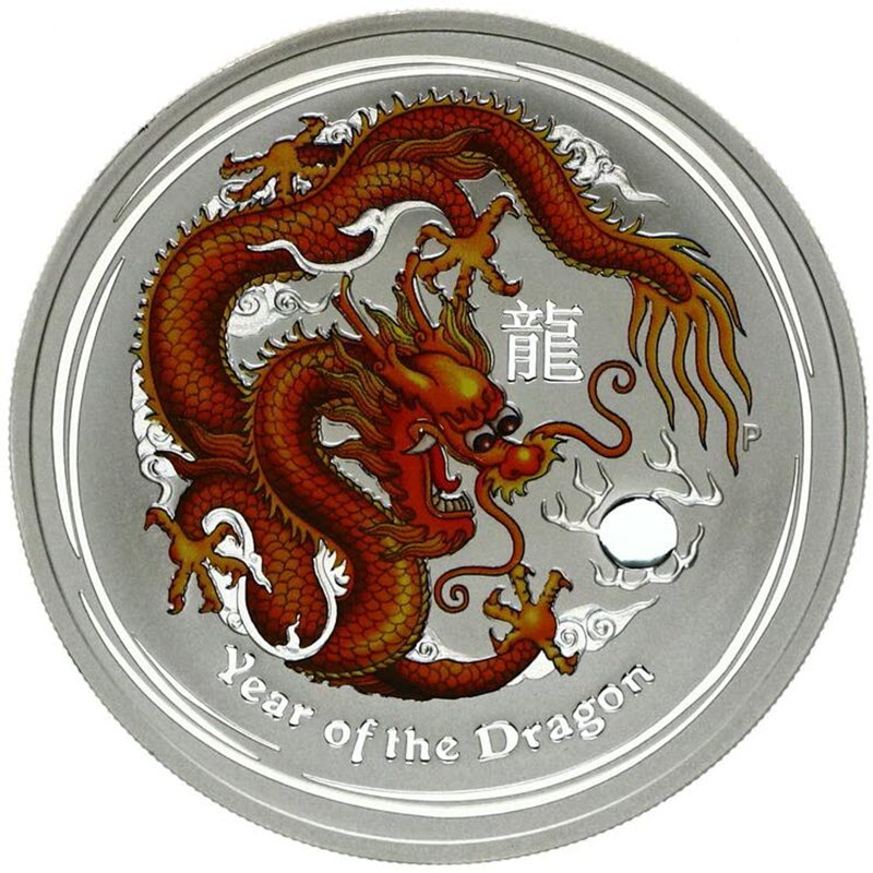 Серебряная монета из второй серии "Лунный календарь" - год Дракона 2012 года выпуска работы дизайнера Ing Ing Jong. В китайской культуре люди, рожденные в год Дракона, считаются уверенными в себе, независимыми, предприимчивыми, смелыми и страстными. Монеты были сделаны согласно девяти цветным изображениям на стене девяти драконов в Китае. Помимо монеты в традиционном исполнении в серебре, были представлены драконы в красном, синем, коричневом, фиолетовом, серебряном, белом, желтом, черном и золотом цветах.