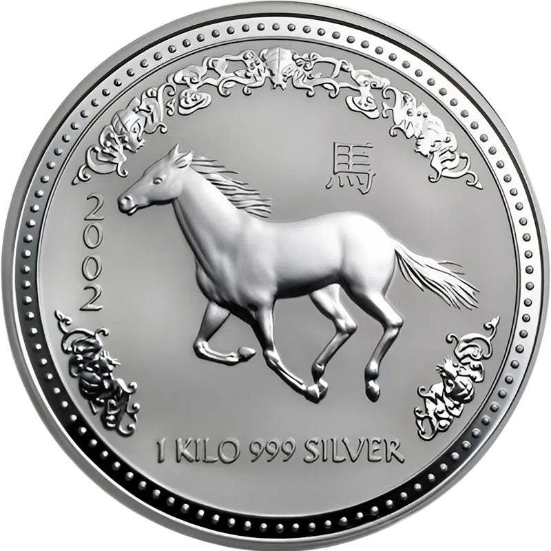 На реверсе изображена скачущая лошадь - символ 2002 года по китайскому календарю, окруженная стилизованным орнаментом. Справа — иероглиф 馬 (Лошадь), слева — 2002 (год чеканки). Внизу надпись -1 KILO 999 SILVER (вес и проба серебра).