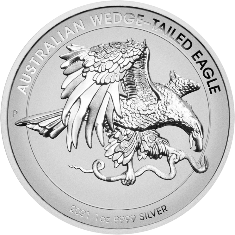 На реверсе изображен клинохвостый орёл в полёте, с пойманной змеёй в когтях. Вдоль канта надписи: AUSTRALIAN WEDGE-TAILED EAGLE 2021 1 oz 9999 SILVER (Австралийский клинохвостый орёл, год чеканки, вес и проба серебра). Слева: знак P (Пертский монетный двор).