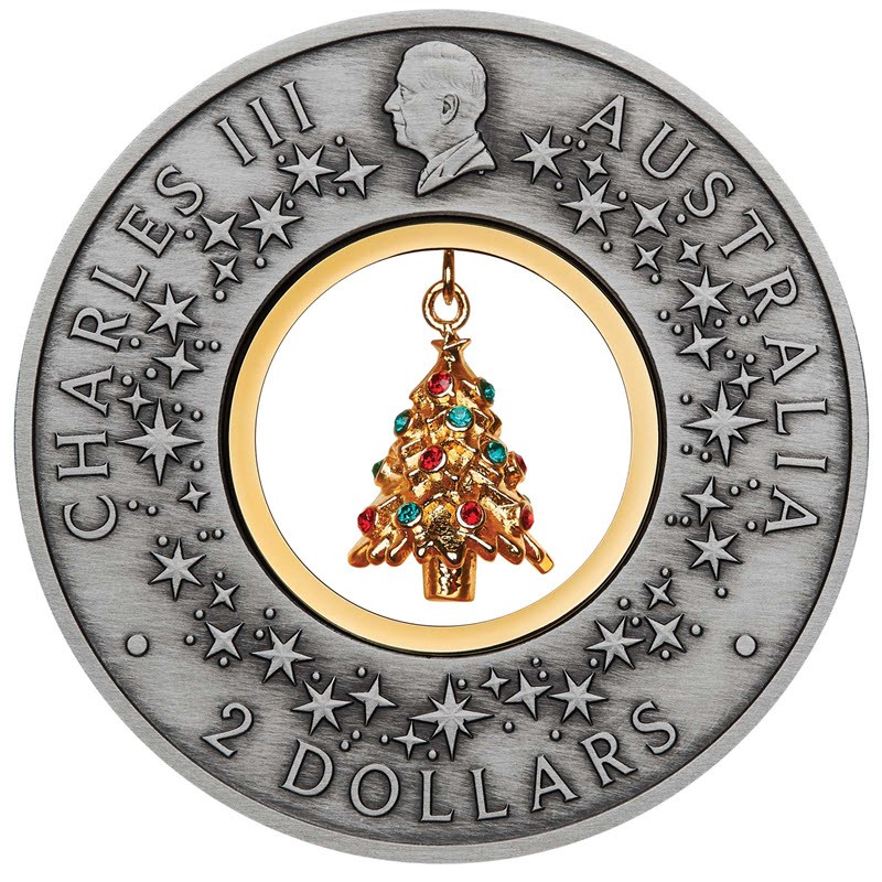 На реверсе изображена мастерская Санты-Клауса, где эльфы создают игрушки и подарки к Рождеству. В центре на подвеске рождественская ель, покрытая 24-каратным золотом и усыпанная кристаллами Swarovski. Вверху надпись: 2025 2 oz 9999 SILVER (год чеканки, вес и проба серебра). Внизу монограмма Пертского монетного двора Р. Правее инициалы дизайнера: JM (Jennifer McKenna).