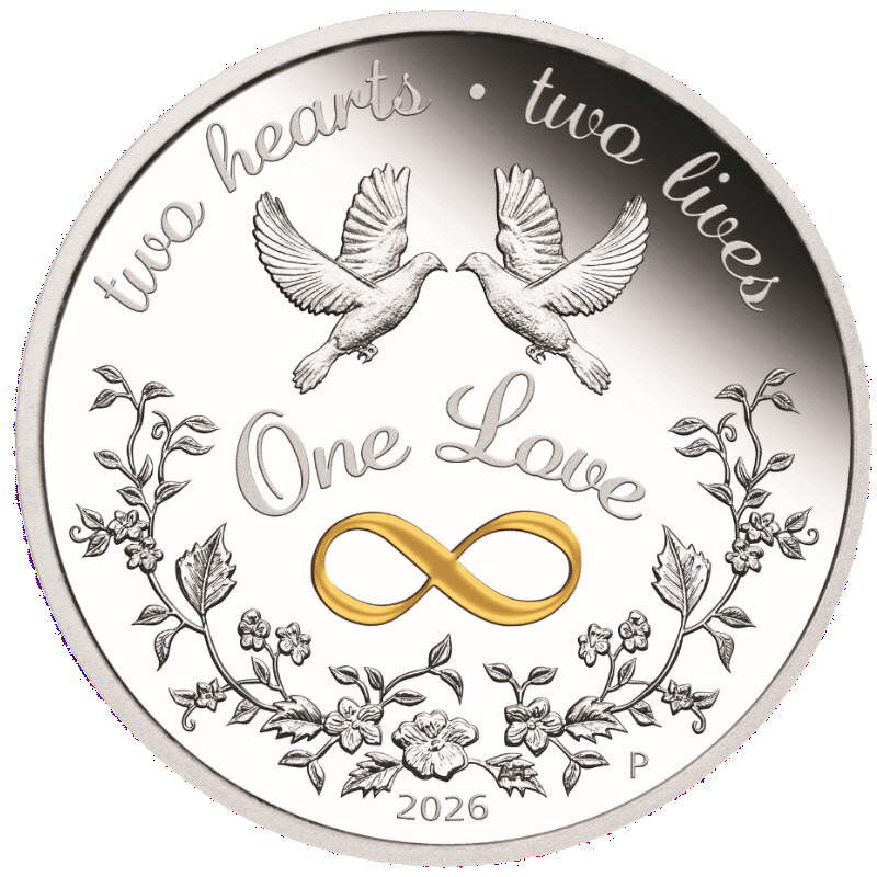 На реверсе изображены два голубя, золотой символ бесконечности и узор из цветов и листьев. В центре надпись: One Love, вдоль канта: two hearts • two lives 2026 (два сердца, две жизни, год чеканки). Выше и правее 5 в 2026 инициалы дизайнера AH (Aleysha Howarth).