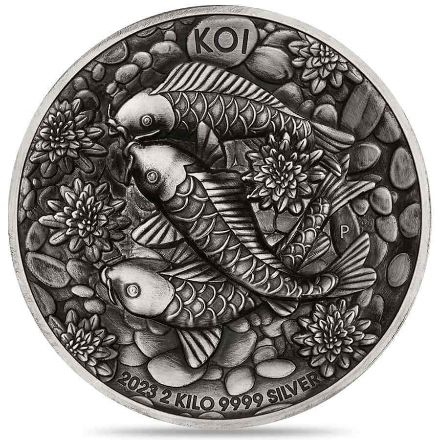 На реверсе монеты изображены рыбы кои, которые часто изображаются как символ инь-янь. Известные своей энергией и упорством, позволяющими им плыть против сильных течений, кои ассоциируются с силой, решительностью и успехом. В верхней части реверса надпись: "KOI" - название монеты. В нижней части: "2023 2 KILO 9999 SILVER" - год выпуска с указанием массы монеты и чистоты серебра.
