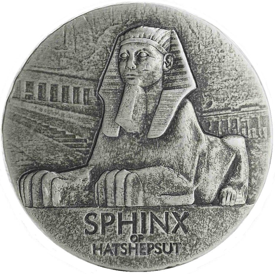 Серебряная монета Чада «Египетские реликвии. Сфинкс Хатшепсут» 2019 г.в. посвящена египетской женщине-фараону Хатшепсут, Нового царства Древнего Египта из XVIII династии. У монеты великолепный дизайн, подражающий древним монетам. Эта монета входит в серию «Египетские реликвии».