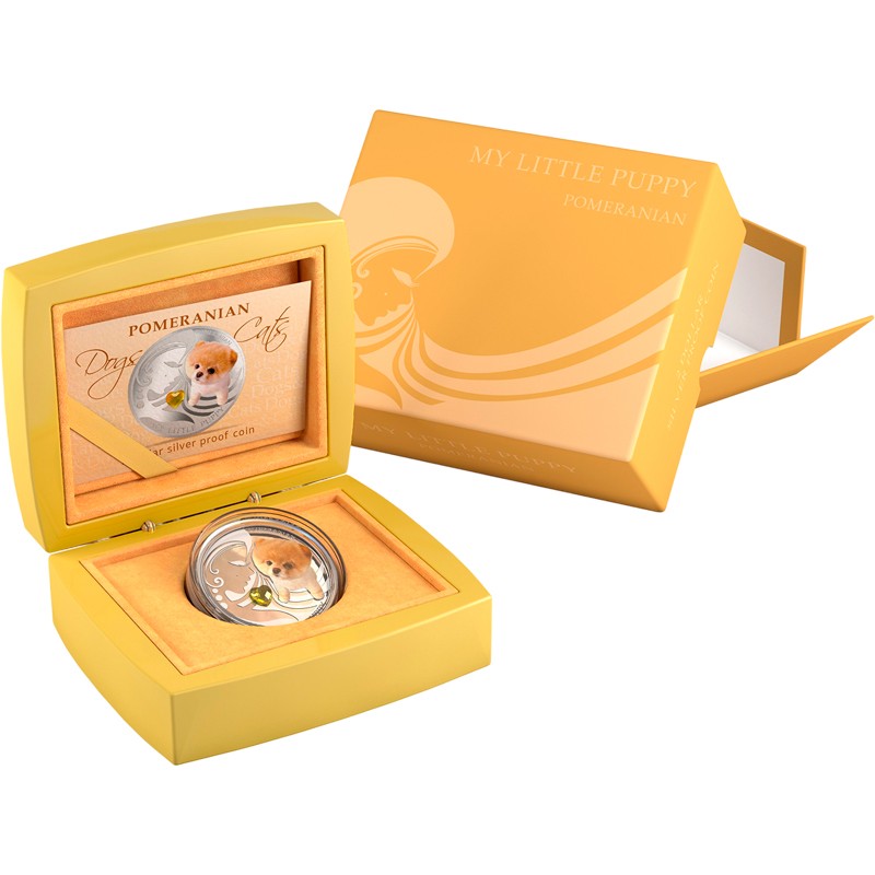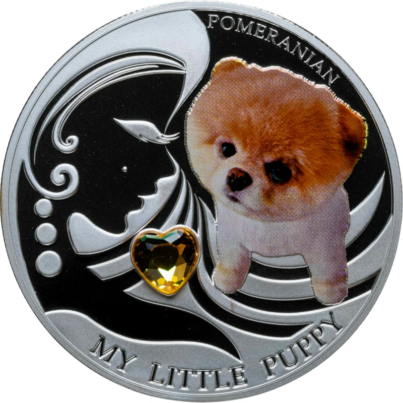 Эта чудесная серебряная монета весом 1 унция из серии «Собаки и кошки» (Dogs&Cats) посвящена собаке породы Померанский шпиц.