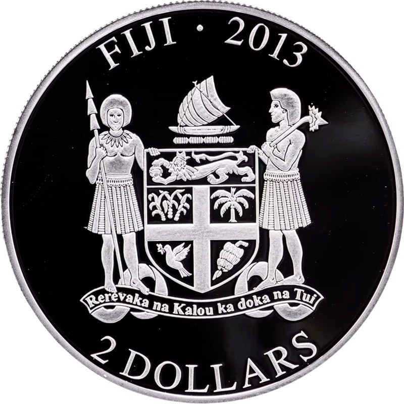В центре - герб Фиджи – щит, который поддерживают два фиджийских воина в традиционных одеждах. Воин слева держит длинное копье, справа - традиционную тяжелую дубинку. Над щитом — такуа — традиционное фиджийское каноэ с парусом. Под щитом на ленте надпись: Rerevaka na Kalou ka doka na Tui (Бойся Бога и чти Короля). Вверху вдоль канта надпись: FIJI 2013 (страна-эмитент, год чеканки), внизу - 2 DOLLARS (номинал).