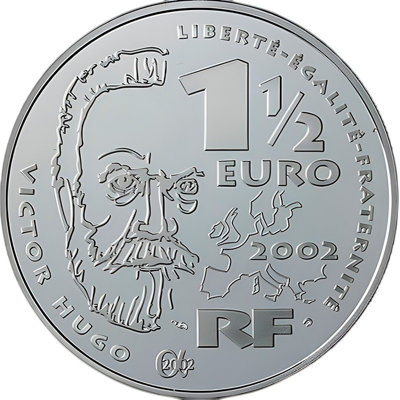 В центре монеты - профиль Виктора Гюго и стилизованная карта Европы. В центре – 1 ½ EURO 2002 RF (номинал, год чеканки, страна эмитент). Рядом знак монетного двора Франции (рог изобилия) и личное клеймо гравера. Вдоль канта по кругу - девиз Франции LIBERTÉ – ÉGALITÉ - FRATERNITÉ  (Свобода, Равенство, Братство), имя писателя VICTOR HUGO (Виктор Гюго).