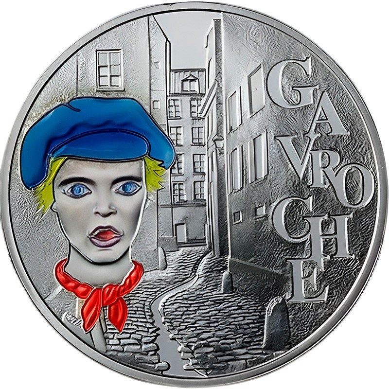Эта чудесная серебряная монета Парижского монетного двора Франции из серии к 200-летию со дня рождения Виктора Гюго, посвящена главному персонажу романа «Отверженные» — Гаврошу.
