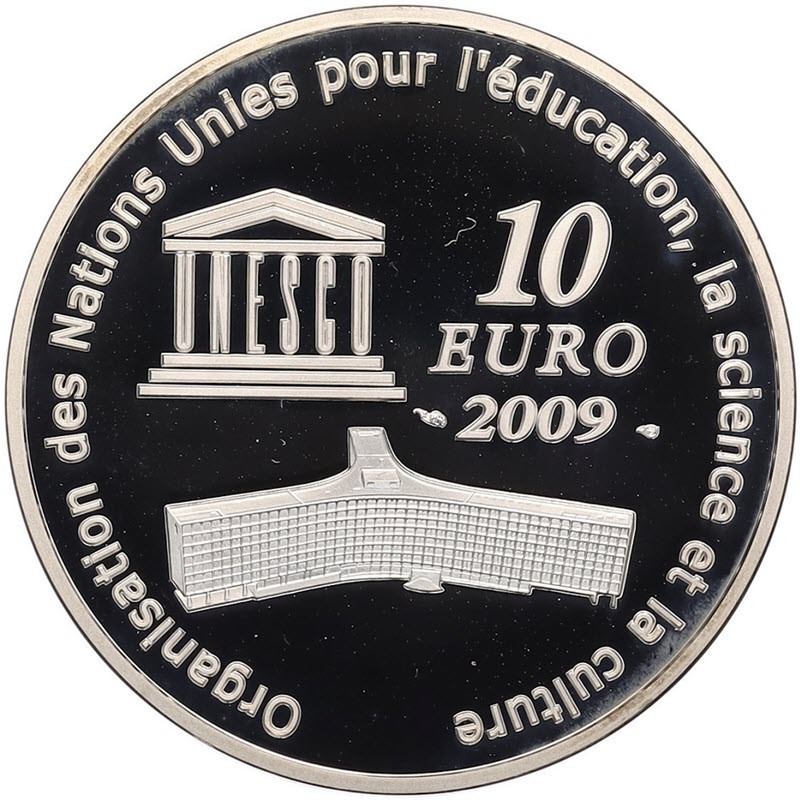 На аверсе изображены логотип ЮНЕСКО (UNESCO) и здание штаб-квартиры организации в Париже. Справа номинал и год чеканки: 10 EURO 2009. Вдоль канта надпись: Организация Объединённых Наций по вопросам образования, науки и культуры (фр. Organization L’Organisation des Nations Unies pour l’education, la science et la culture).