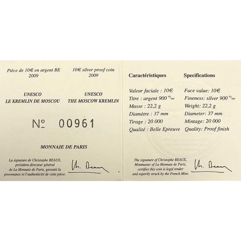 Серебряная монета Франции "Всемирное наследие ЮНЕСКО. Московский Кремль" 2009 г.в., 22.2 г чистого серебра (проба 900)