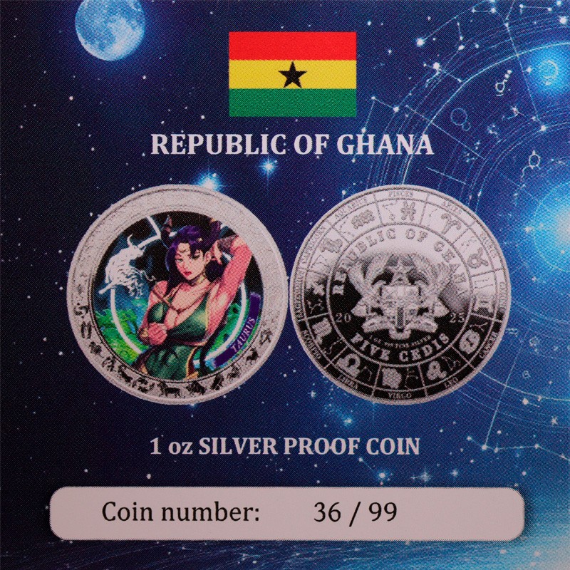 Серебряная монета Ганы "Аниме Зодиак. Телец" 2025 г.в. (пруф), 31.1 г чистого серебра (проба 999)