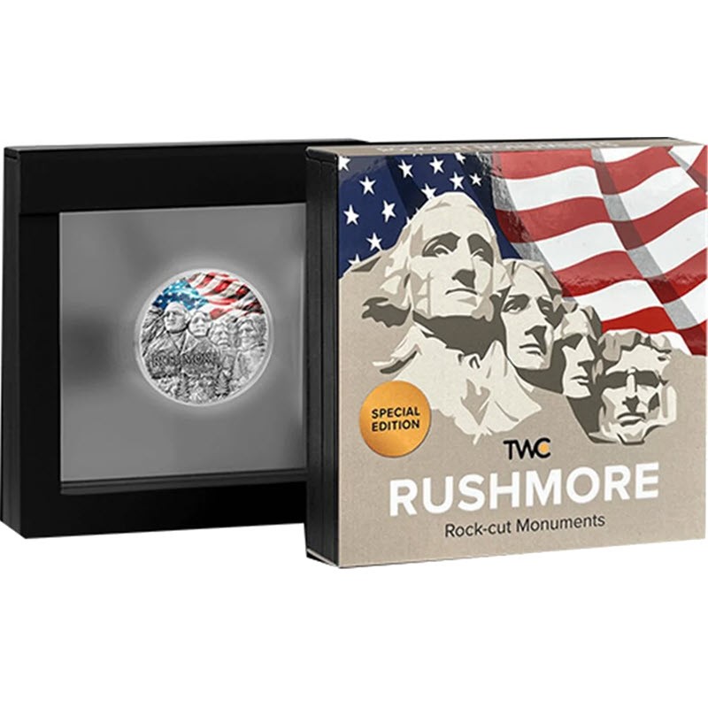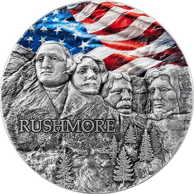 Эта чудесная серебряная монета весом в 2 унции из серии «Высеченные в скалах памятники» посвящена Горе Рашмор. У неё высокий рельеф, качество античной отделки и селективная окраска. Поставляется в футляре с сертификатом подлинности. Тираж: 999 штук.