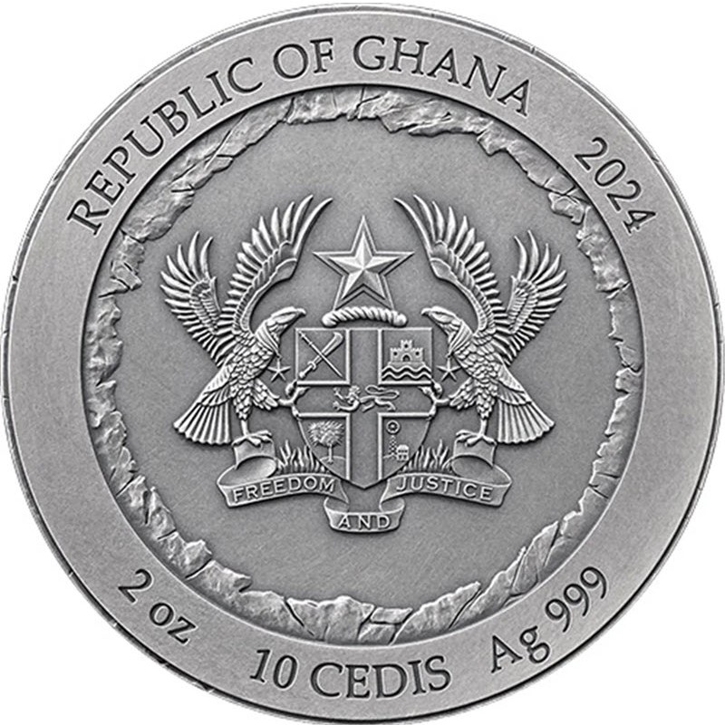 На аверсе изображен герб Республики Гана. Вдоль канта надпись: REPUBLIC OF GHANA 2024 2 oz 10 CEDIS Ag 999 (страна-эмитент, год чеканки, вес и проба серебра, номинал).