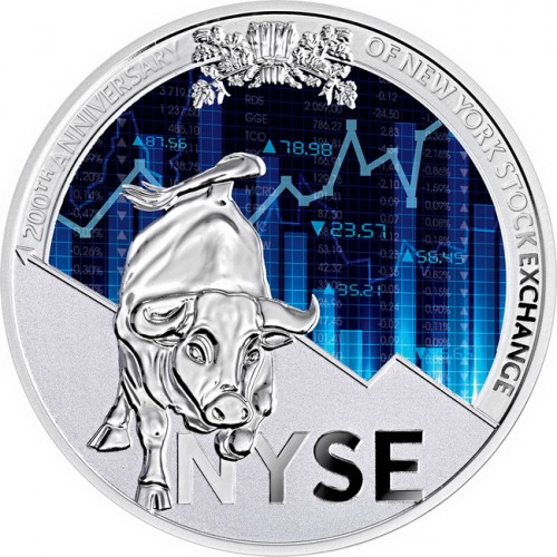Серебряная монета Камеруна «200 лет Нью-Йоркской фондовой бирже» 2017 года выпуска. Часть реверса монеты имеет флюоресцентную поверхность. Ограниченный тираж.