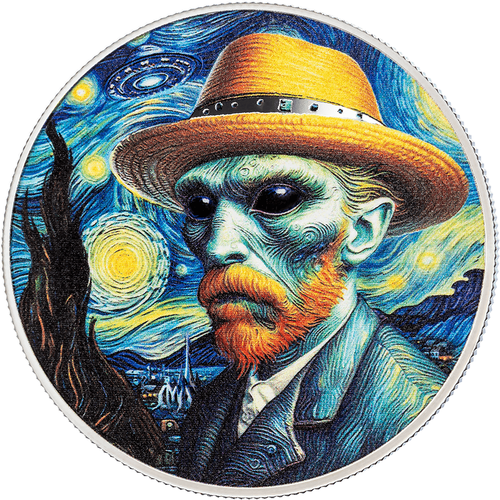 На реверсе этой серебряной монеты изображен сюрреалистический Ван Гог с пронзительными инопланетными глазами и культовой шляпой под звездным небом.