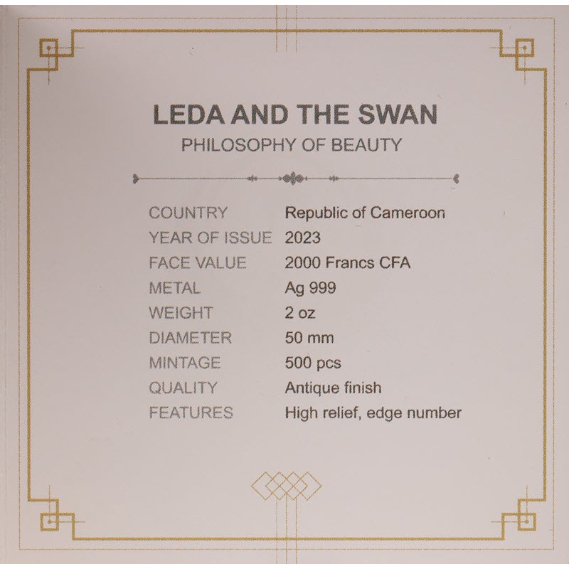 Серебряная монета Камеруна "Философия красоты: Леда и Лебедь" 2023 г.в., 62.2 г чистого серебра (Проба 999)