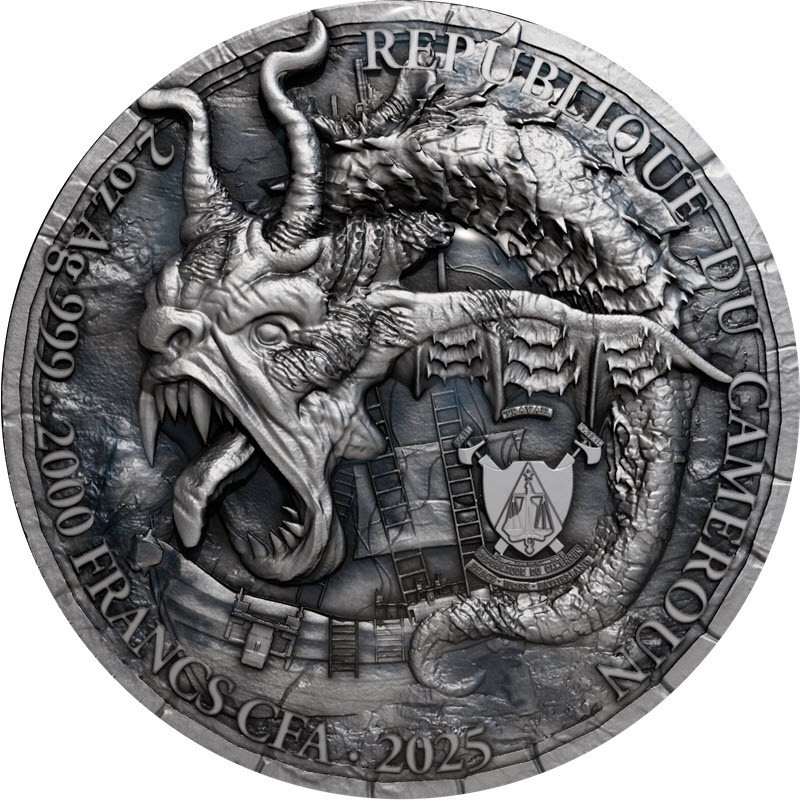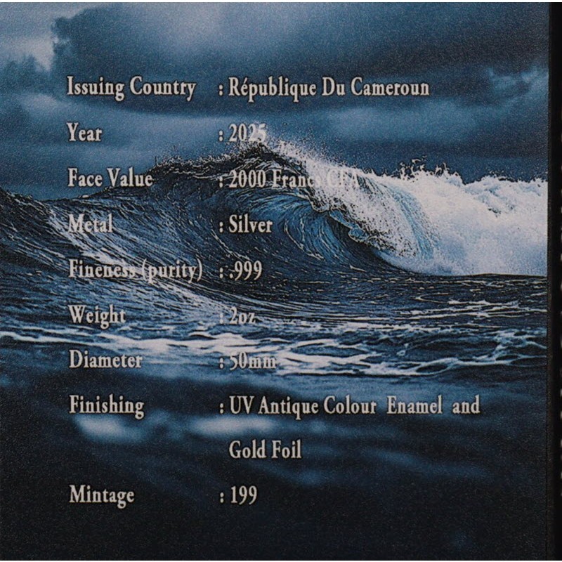 На аверсе изображено морское чудовище на фоне затонувшего корабля. Справа герб Камеруна. Вдоль канта надпись: REPUBLIQUE DU CAMEROUN 2oz Ag 999 · 2000 FRANCS CFA · 2025 (страна-эмитент, вес и проба серебра, номинал, год чеканки).