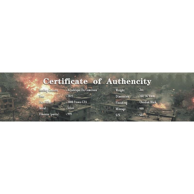 На аверсе изображен гранатомет. Надпись: REPUBLIQUE DU CAMEROUN 2OZ Ag 999 • 2000 FRANCS CFA • 2025 (страна-эмитент, вес и проба серебра, номинал, год чеканки).