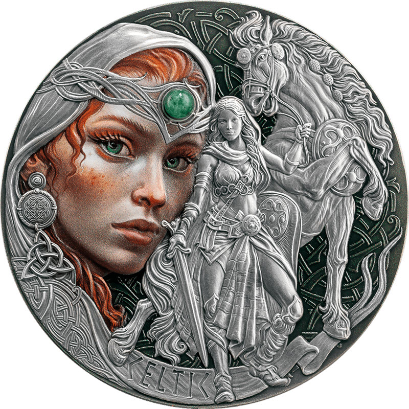 Серебряная монета Камеруна из серии «Женщины-воины» посвящена кельтской воительнице. У нее качество античной отделки, высокий рельеф и селективная окраска. Поставляется в оригинальном футляре с сертификатом подлинности. Тираж: 500 штук.