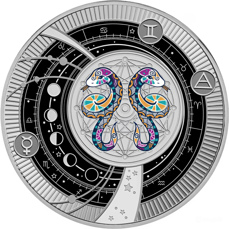 Эта потрясающая серебряная монета-подвеска на шнурке посвящена третьему астрологическому знаку зодиака - “Близнецы” (Gemini). Считается, что к нему принадлежат рождённые с 21 мая по 20 июня. Близнецы — это энергичные и любопытные натуры, склонные к переменам и новизне.