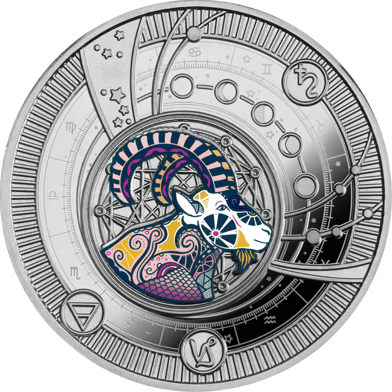 Эта потрясающая серебряная монета-подвеска на шнурке посвящена десятому астрологическому знаку зодиака - “Козерог” (Capricornus). Людей, родившихся под знаком зодиака Козерог - в период с 22 декабря по 20 января - в астрологии часто описывают как практичных, пунктуальных и амбициозных.