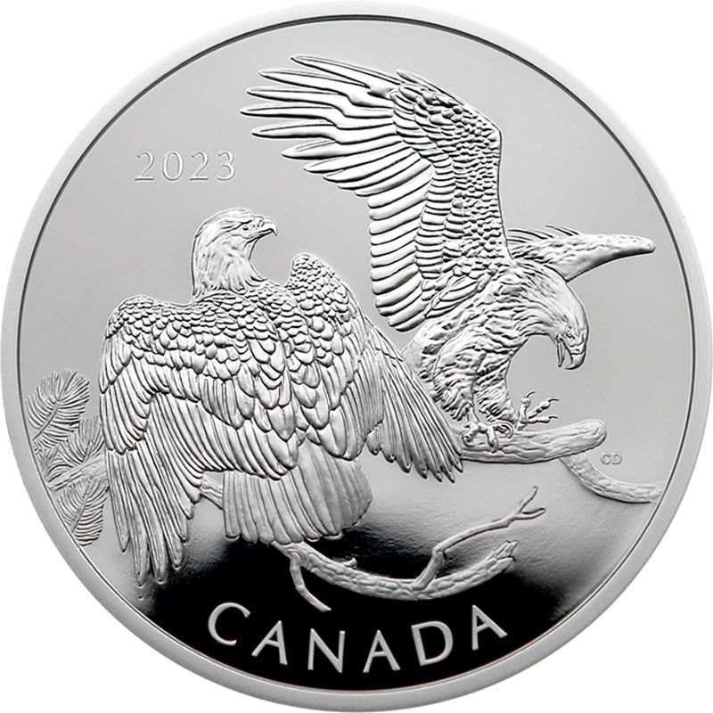 На реверсе изображены два орлана с расправленными крыльями. Вверху надпись: 2023 (год чеканки), справа: CD (инициалы дизайнера Claudia D´Angela), внизу: CANADA (страна-эмитент).