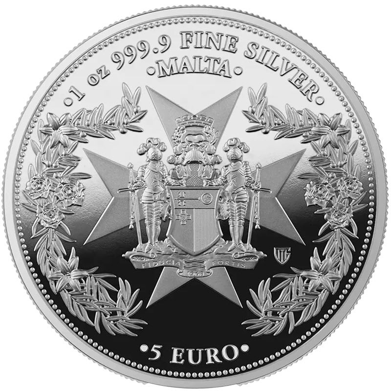 На аверсе изображен герб Центрального банка Мальты. Внизу герба на ленте надпись: FIDUCIA FORTIS 1968. Справа от герба монограмма монетного двора Германии (GM Germania Mint). Герб окружен оливковыми и пальмовыми ветвями, символами мира. Цветки лилии символизируют величие и славу, а розы – атрибут чистоты и гармонии. Вверху вдоль канта надпись: · 1 oz 999.9 FINE SILVER · (вес и проба серебра), ниже: · MALTA · (страна-эмитент). Внизу: · 5 EURO · (номинал). На гурте индивидуальный номер монеты.