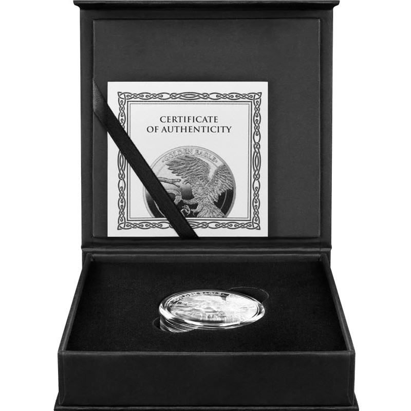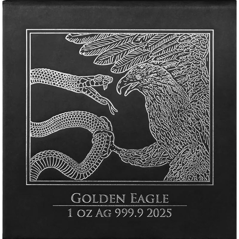 На реверсе изображена битва мощного Орла с опасным и злобным Змием на фоне стилизованных морских вод Средиземноморья. Вверху вдоль канта надпись: · GOLDEN EAGLE · , внизу: · 2025 · (год чеканки).