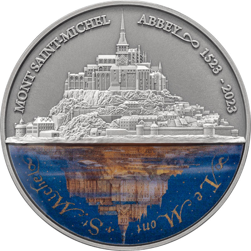 Вверху вдоль канта вверху полукругом надписи: MONT SAINT-MICHEL ABBEY 1523 – 2023 (Аббатство Мон-Сен-Мишель 1523-2023), внизу на французском - Le Mont St. Michel.